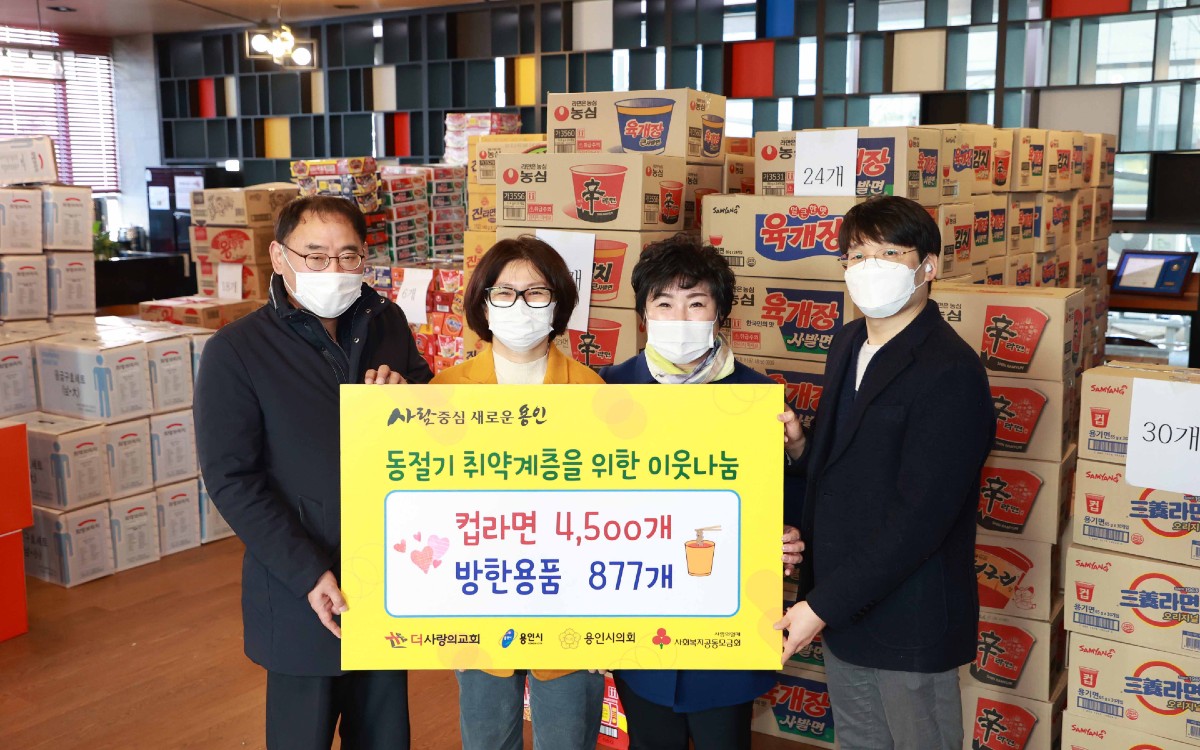 또 이날 수원시 영통구에 위치한 더사랑의교회(담임목사 이인호)가 따뜻한 손길이 필요한 노숙자와 소외이웃에게 전달해 달라며 교인들이 십시일반 모은 컵라면 4,500개와 방한용품 877개를 기부했다.