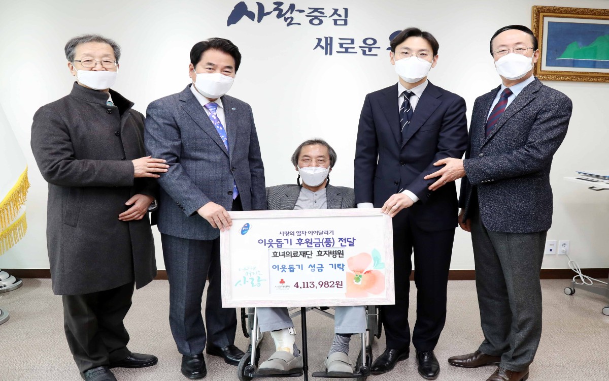 이날 이수용 대표와 민성길 진료원장, 김희배 관리원장, 김재만 총무계장은 시장실을 방문해 이웃돕기 성금 4,113,982원을 전달했다. 효자병원의 기탁은 지난 2016년부터 매년 이어졌으며 지금까지 총 2천350여만 원의 성금이 필요한 이웃을 위해 쓰였다.