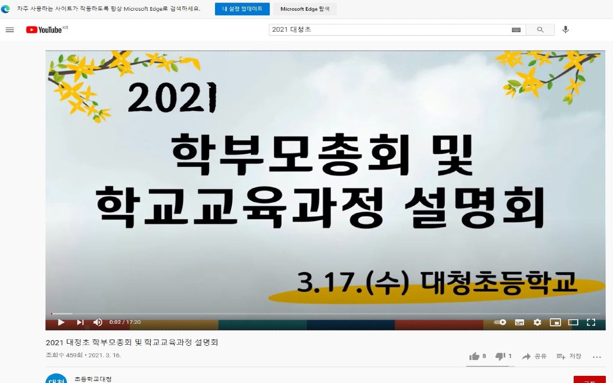 용인시 대청초등학교(교장 김미숙)는 지난 3월 17일 코로나19로 대면이 어려운 상황 속에서도, 학교 비전과 학교교육활동 정보를 공유하기 위해, 온라인으로 ‘2021 학부모총회 및 학교교육과정 설명회’를 개최했다.