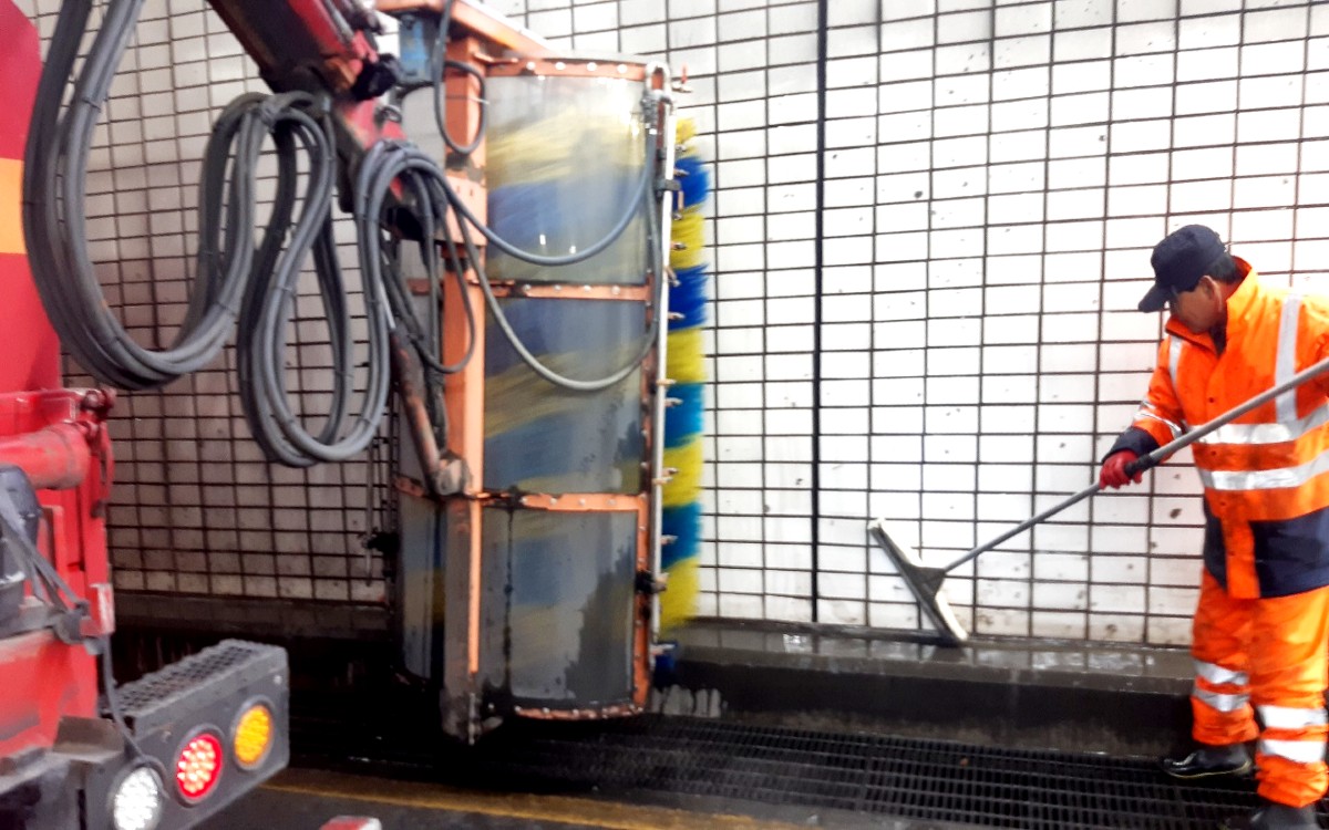 시는 전용 차량으로 벽면에 고압수를 뿌린 후 솔로 세척하고, 배수로 등 잘 보이지 않는 곳의 쓰레기도 제거한다.