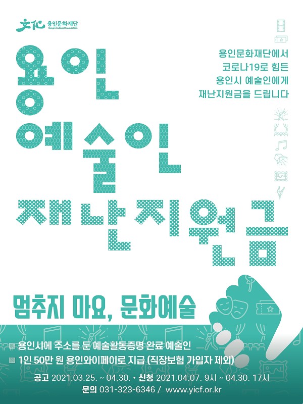 (재)용인문화재단(이사장 백군기)은 코로나19 사태로 경제적 어려움을 겪는 용인 예술인들에게, 재난지원금을 지급하는 <2021 용인 예술인 재난지원금>(이하 <재난지원금>) 지급 사업을 25일 공고와 함께 시작하며, 4월 7일(수)부터 4월 30일(금)까지 대상자의 신청을 받는다.
