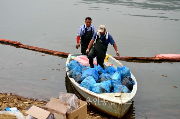 12일 오전 농어촌공사의 연락을 받은 용인시청 환경과 직원들과 55사단 군 병력이 급히 동원되어 방제작업을 펼쳤으나, 역부족으로, 농어촌지방공사에서는 방제전문 업체에게 방제작업을(사업비 약5천~8천만원)맡겨 방제작업을 하고 있으나, 기름 제거작업이 완료되기는 많은 시일이 소요 될 것으로 내다보고 있다.