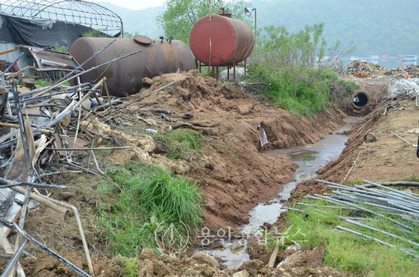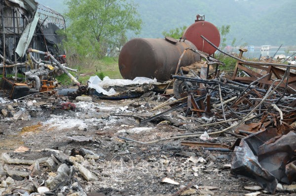 한편 화재로 전소된 화훼단지 하우스와 기름땡크 제거작업을 하던 포크레인 기사는 땡크가 넘어져 벙커시유가 송전저수지로 흘러가자 겁을 먹고 도주한 것으로 알려졌다.
