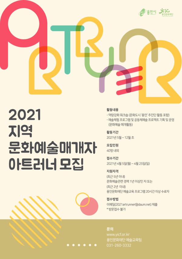 아트러너 활동 및 모집지원에 관한 자세한 내용은 용인문화재단 홈페이지(www.yicf.or.kr) 모집 공고문을 통해 확인할 수 있다.