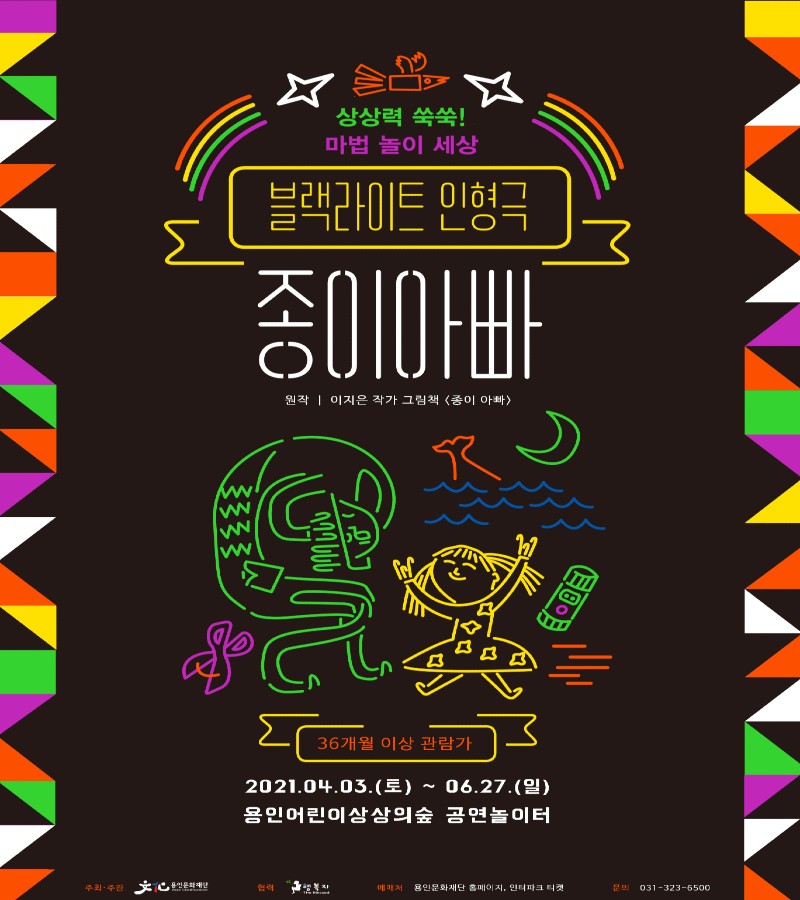 (재)용인문화재단(이사장 백군기)은 가정의 달 5월을 맞이하여, 용인어린이상상의숲 공연놀이터에서 진행되는 블랙라이트 인형극 ‘종이아빠’의 어린이날 및 주말 공연 회차를 추가한다고 밝혔다.