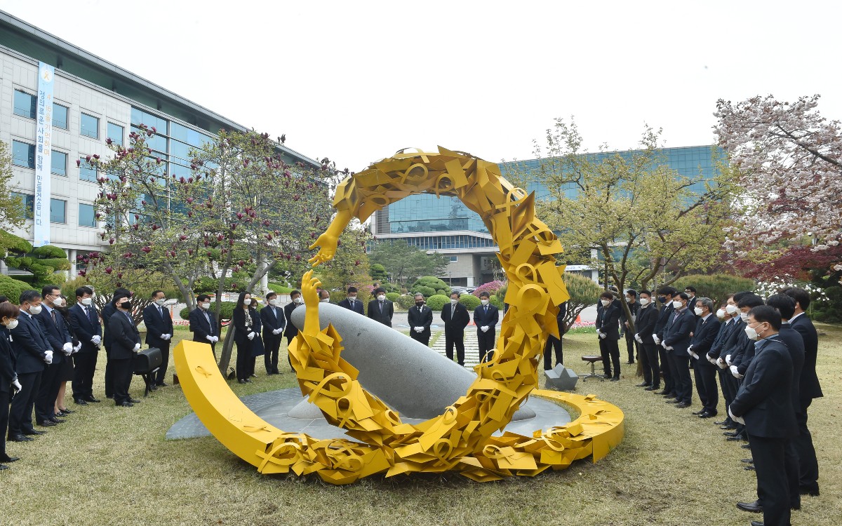 이재정 교육감은 헌화를 모두 마친 뒤, 도교육청 남부청사로 이동해 청사에 마련된 세월호 조형물 앞에서, 국·과장 등과 희생자들을 기리는 추모식을 했다.