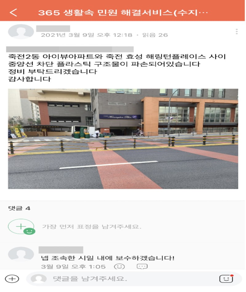 수지구 죽전2동에 거주 중인 A씨는 아이뷰아파트와, 효성해링턴플레이스 사이 중앙선 플라스틱 구조물이 파손된 것을 발견했다. A씨는 네이버 밴드를 통해 구청에 신고했고, 하루 만에 조치한 결과를 사진으로 받아볼 수 있었다.