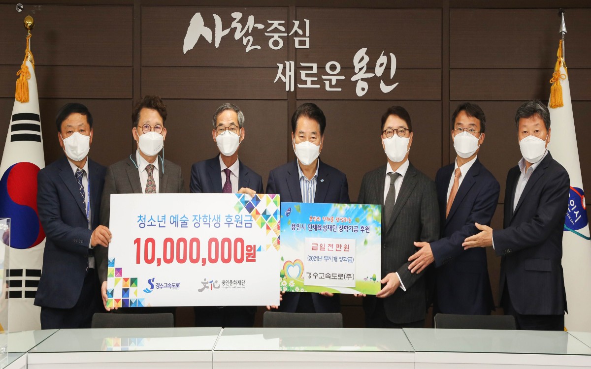경수고속도로는 16일 용인시청 시장실을 방문해, 용인시 인재육성재단과 용인문화재단에 각각 1천만 원씩 총 2천만 원을 장학금 명목으로 전달했다.