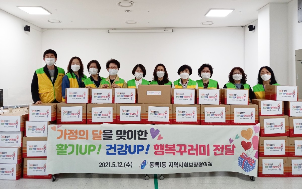 용인시 기흥구 동백1동은 지역사회보장협의체(위원장 신현녀)가 5월 가정의 달을 맞아 관내 저소득층을 위한 행복꾸러미를 만들어 전달했다고 12일 밝혔다.