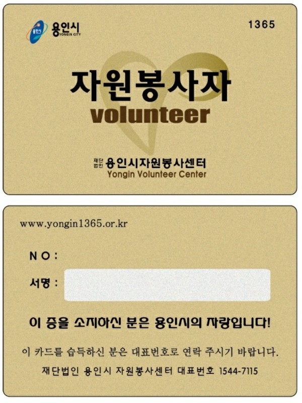 1365 자원봉사 포털사이트에 회원가입이 되어있는(또는 신규 회원가입한) 용인시 소속의 자원봉사자라면, 누구나 해당 카드를 발급받을 수 있으며, 발급신청서를 작성해서 제출하면 된다.