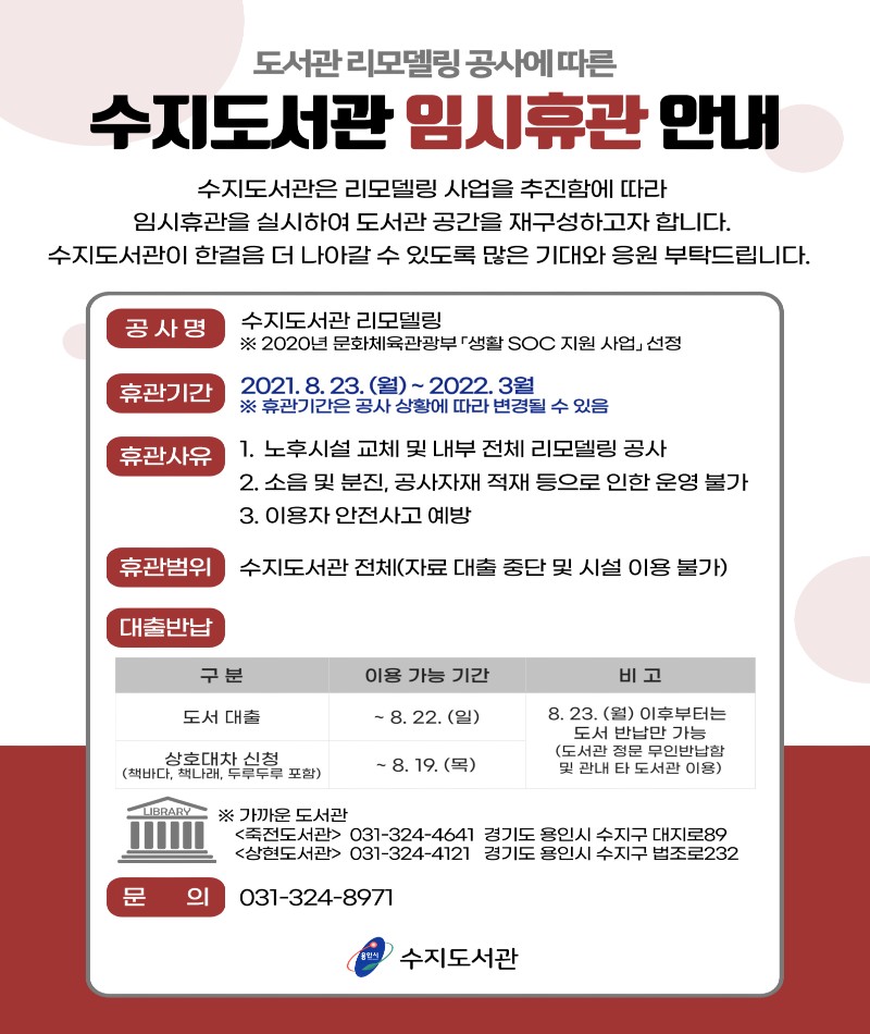시는 이번 리모델링 공사를 통해 냉·난방시스템 등 기본적인 시설물 교체는 물론 열람 공간 확대, 소모임실 마련, 북카페 설치 등으로 수지도서관을 소통과 휴식이 공존하는 개방형 복합문화공간으로 변화시킨다는 방침이다.