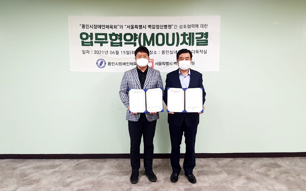 용인시장애인체육회(회장 백군기)와 용인시 백암면에 위치한, 서울시립백암정신병원이 상호 발전 도모 및 교류를 위한 업무협약을 체결했다.