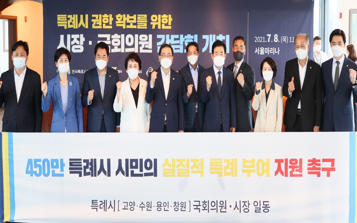 백군기 용인시장, 이재준 고양시장, 염태영 수원시장, 허성무 창원시장과 정춘숙·김영진·백혜련·한준호·최형두 의원 등은, 이날 서울 마리나컨벤션센터에서 간담회를 갖고, 실질적인 특례 부여를 위해 정부 지원을 촉구하는 내용의 공동성명문를 발표했다.