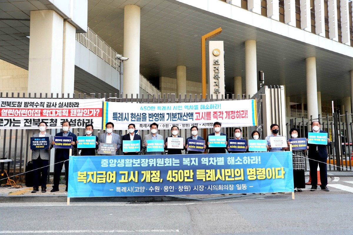 이에 전국특례시시장협의회(대표회장 창원시장 허성무)는 26일부터 28일까지 릴레이 1인시위를 진행하고, 27일 화력을 집중하여 공동 규탄 집회를 개최했다. 28일 열리는 중앙생활보장위원회 본회의를 앞두고 보건복지부를 전방위 압박하기 위해서다.