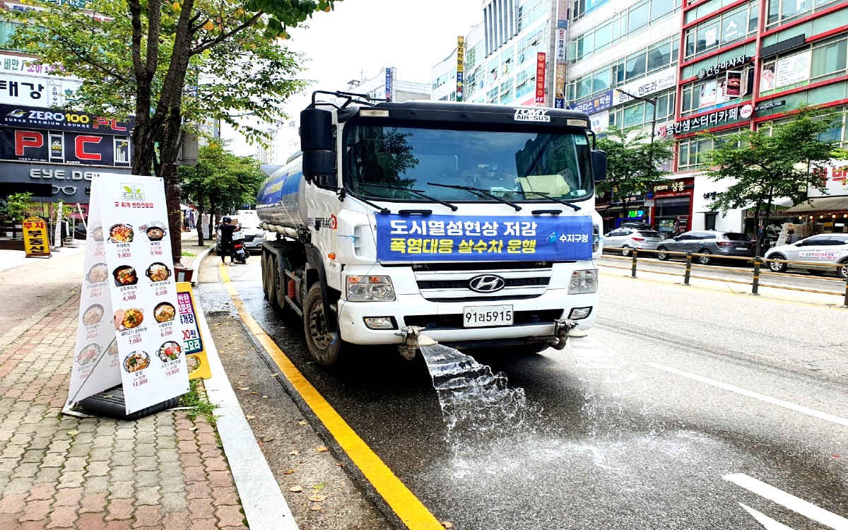시는 우선 도로변 열기를 식히고 과열로 인한 노면변형을 막기 위해 지난 7월 1일부터 살수차 3대를 동원해 매일 오전 10시부터 오후 5시까지 도심 곳곳 203km구간에 살수를 하고 있다.