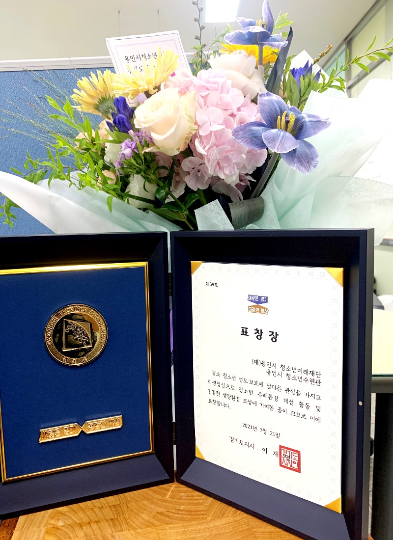 (재)용인시청소년미래재단 용인시청소년수련관에서는, 21만 용인시 청소년 선도·보호에 남다른 관심을 가지고, 도전정신으로 청소년 유해환경 개선 활동 및 건강한 성장환경 조성에 기여한 공로를 인정받아 경기도지사상을 수상했다.