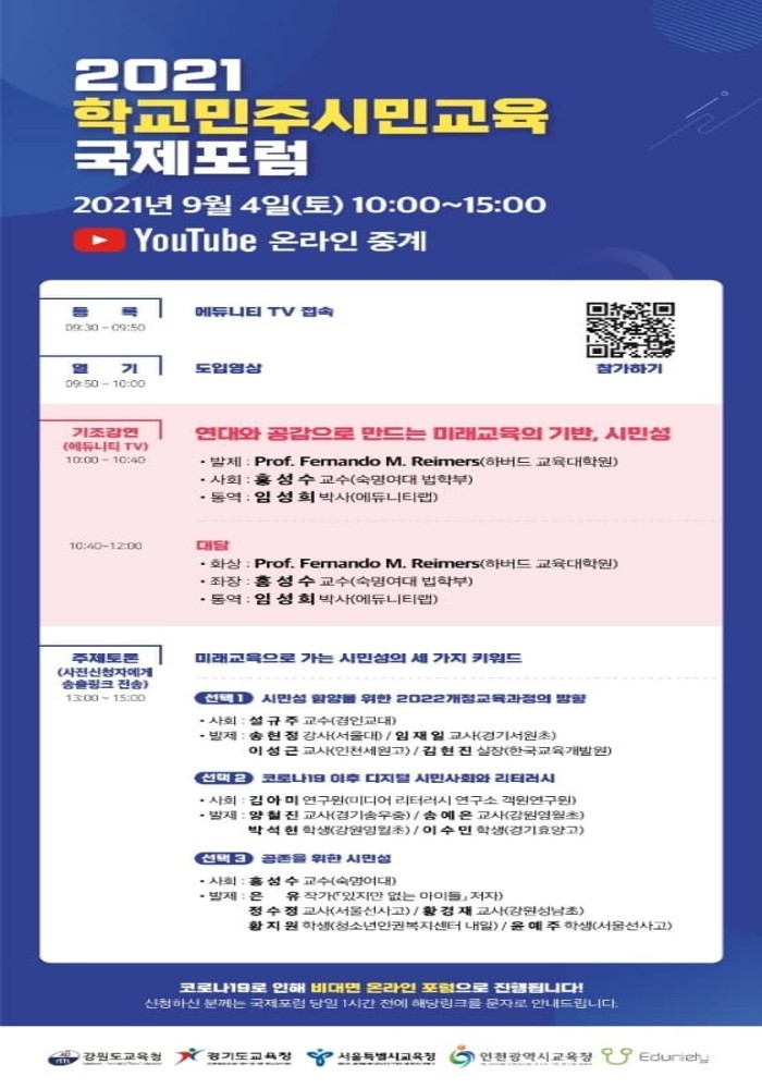 한편, 국제포럼은 4개 시도교육청(경기ㆍ강원ㆍ인천ㆍ서울)이 공동 주최하고, 2019년에는 ‘민주시민교육은 아젠다가 아니라 원칙이다’로, 2020년은 ‘사회적ㆍ정치적 이슈를 학교에서 어떻게 다루어야 하는가’를 주제로 개최했었다.