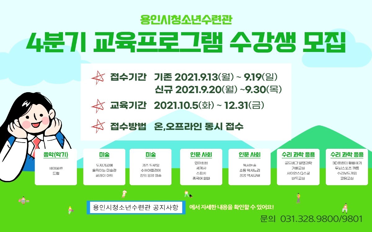 용인시청소년미래재단 청소년수련관에서는 4분기 교육프로그램을, 10월~12월에 진행할 예정이며, 오는 13일부터 수강생을 모집할 예정이다.