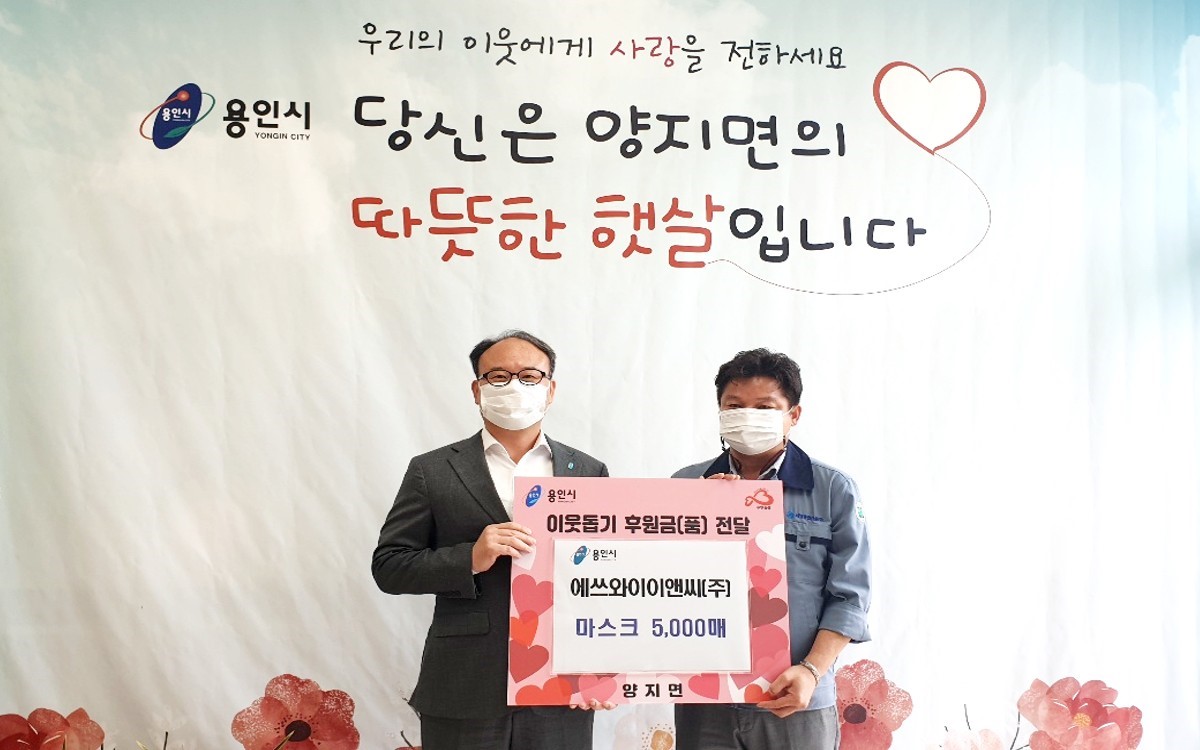 양지면에선 관내 시공 기업의 기부가 있었다. 이날 공동주택 시공업체 에쓰와이이앤씨(주) 임병찬 현장소장 등 관계자들이 면 행정복지센터를 방문해 방역용 마스크 5000장을 기부했다. 전달받은 마스크는 관내 38곳 경로당에 골고루 전달될 예정이다.