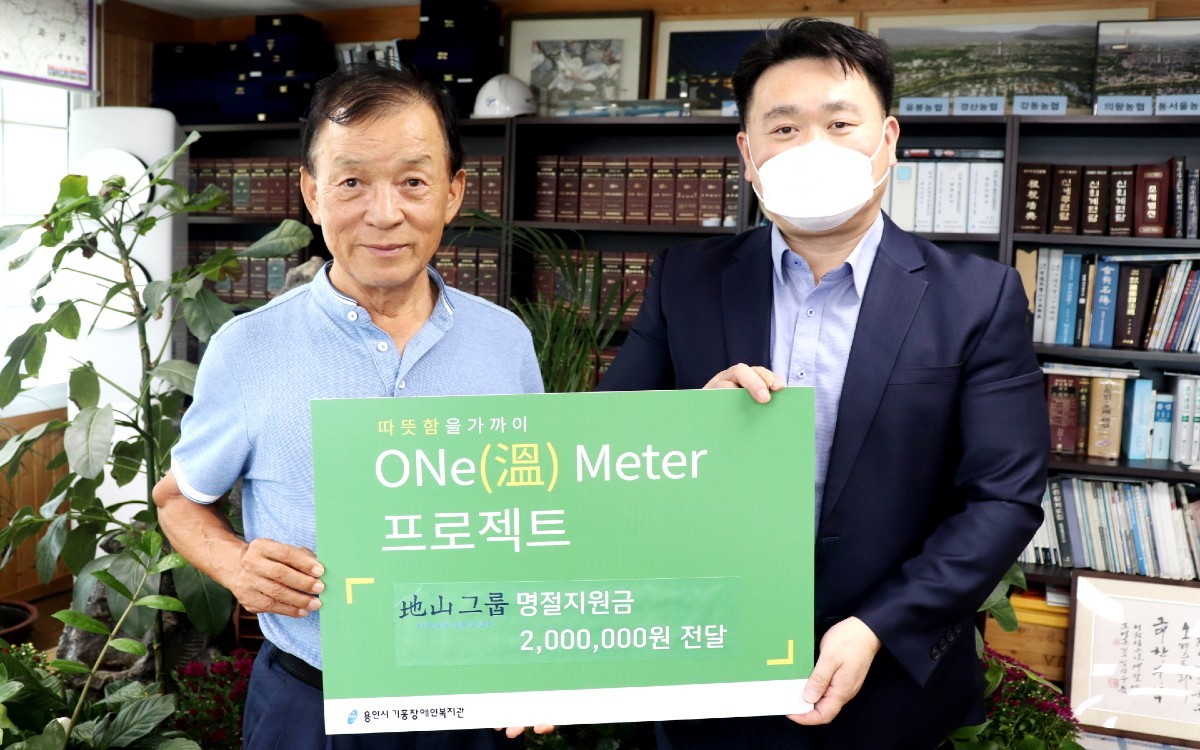 ‘따뜻함을 가까이, ONe(溫) Meter 프로젝트’는 용인시기흥장애인복지관에서, 코로나19 장기화와 사회적 거리두기로 인해 힘든 시기를 보내고 있는, 저소득 장애인을 지원하기 위한 프로젝트로, 지산그룹은 추석명절을 맞아, 지역사회 취약계층 장애인의 따뜻한 명절나기를 위한 지원금을 복지관에 전달했다.