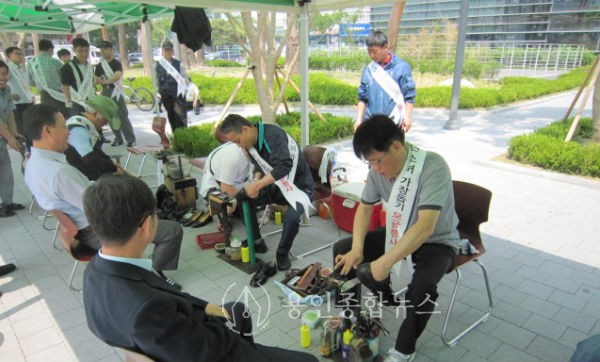 이날 행사에는 수지구에서 구두 수선업을 하는 15인의 기능미화원이 참여했다. 더운 날씨에도 불구하고 생업인 구두닦이의 하루 수입을 포기하고 봉사활동에 나선 것이다.