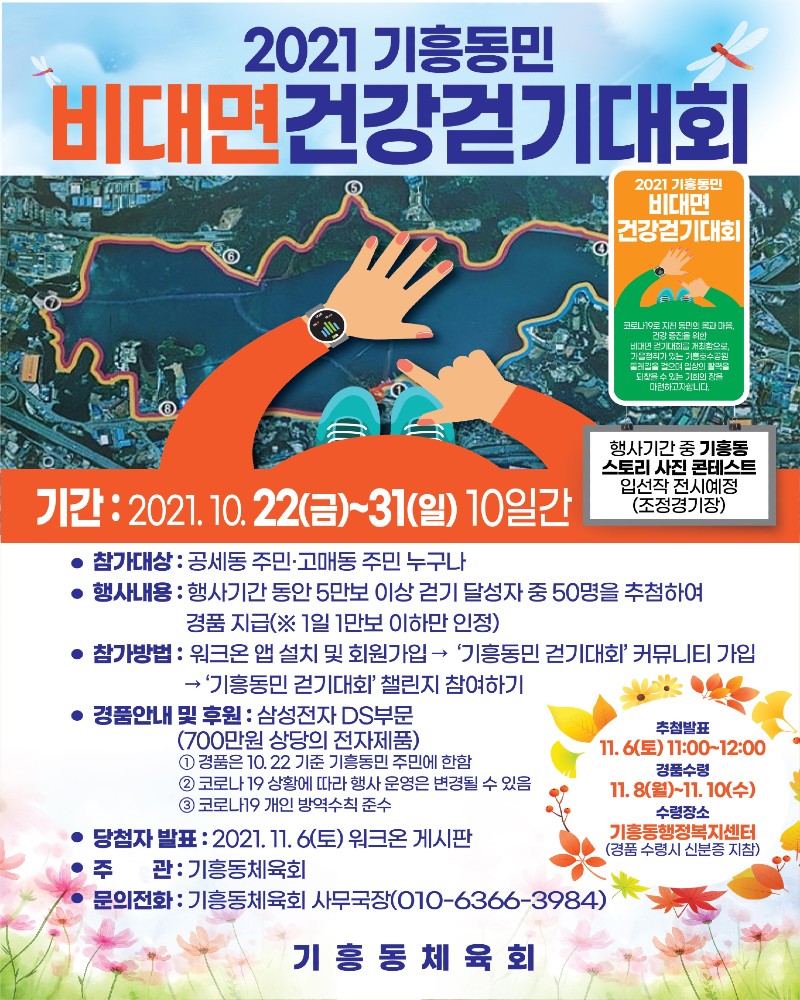 ‘2021 기흥동민 비대면 건강걷기대회’가 22일부터 31일까지 비대면으로 열린다.