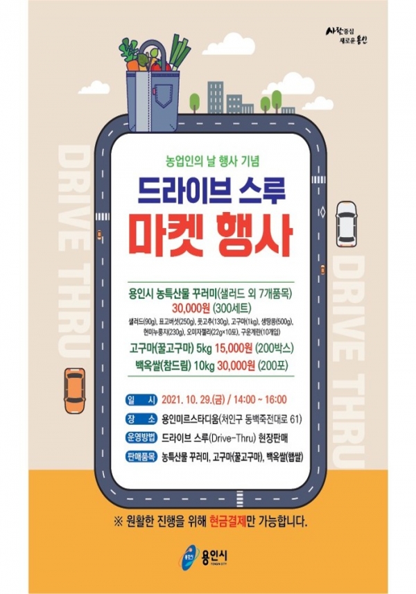 시는 오는 29일 오후 2~4시 처인구 삼가동 용인미르스타디움에서, 드라이브 스루 마켓을 열고, 관내 농가에서 생산한 샐러드채소·표고버섯·풋고추·고구마·생땅콩·현미누룽지·오미자젤리·구운계란 등 8종이 들어있는 농특산물 꾸러미와 고구마(5kg), 백옥쌀(10kg) 등 3개 품목을 판매한다.