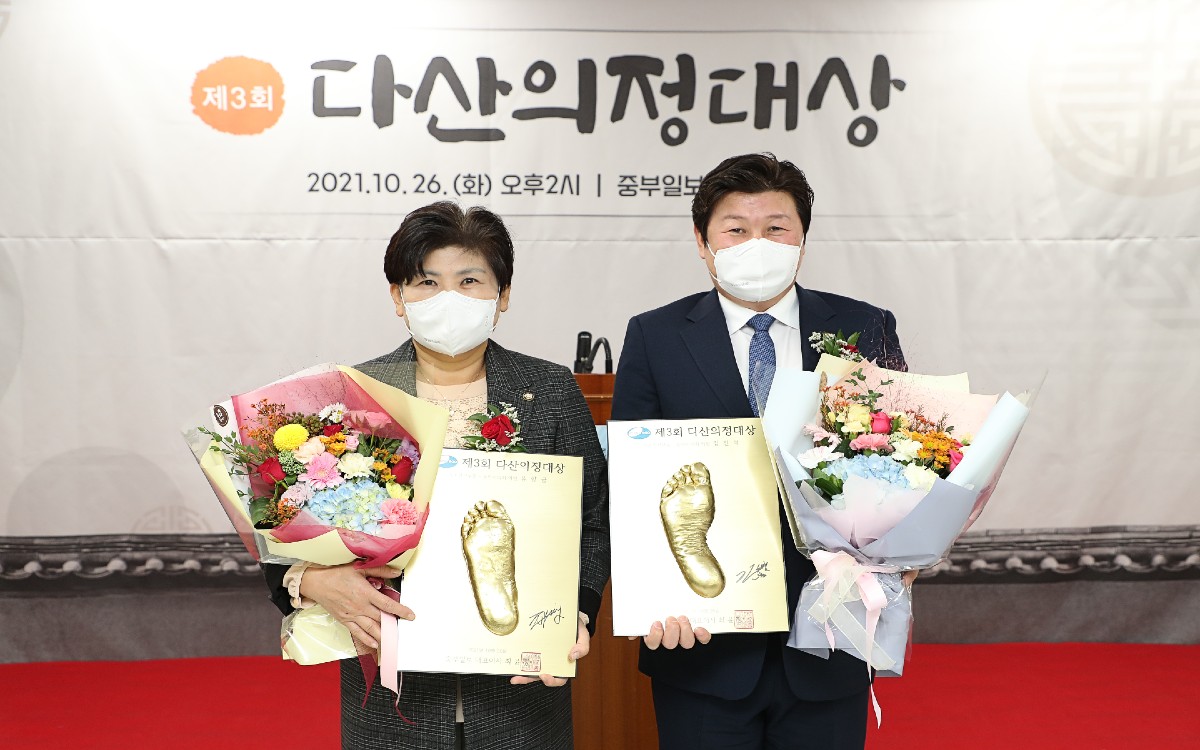 용인시의회 유향금(구성·동백1·동백2·동백3동/국민의힘), 김진석(원삼·백암·양지면,동부동/더불어민주당) 의원이 26일 오후 2시 중부일보 1층 대회의실에서, 중부일보 주최로 열린 ‘제3회 다산의정대상’ 시상식에서 기초정치부문 대상을 수상했다.