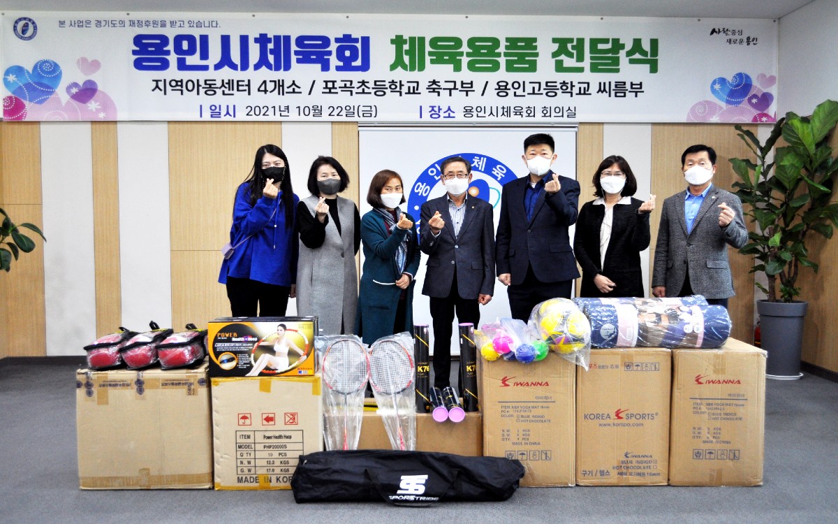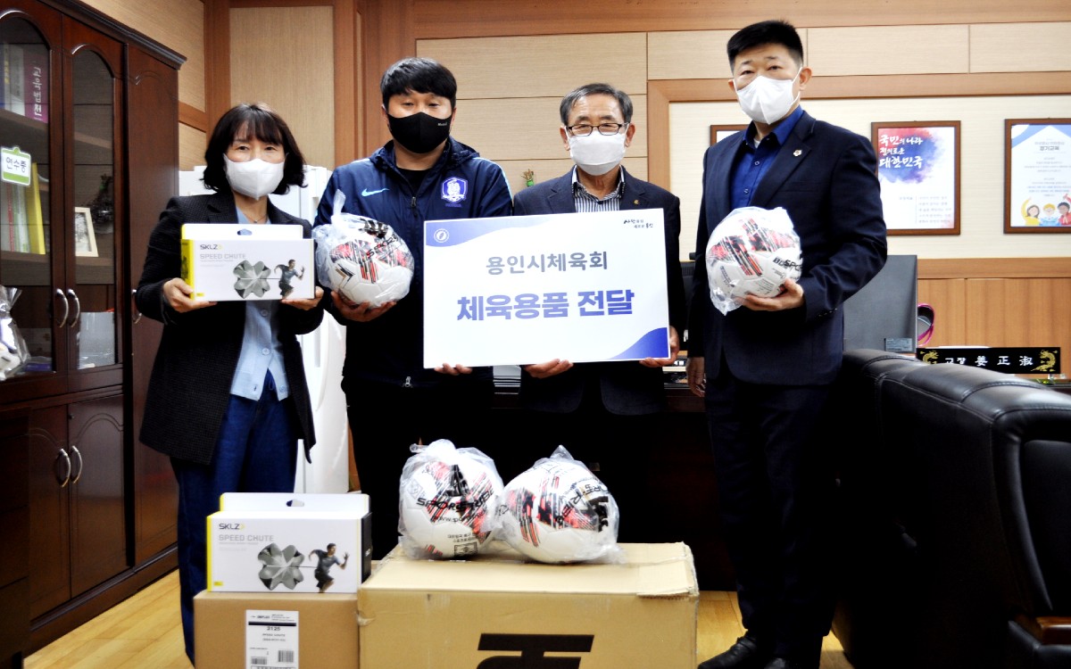 용인시체육회(회장 조효상)는, 2021년 10월22일(금) 본회 회의실 및 학교 교장실에서 체육용품 전달식을 진행했다.