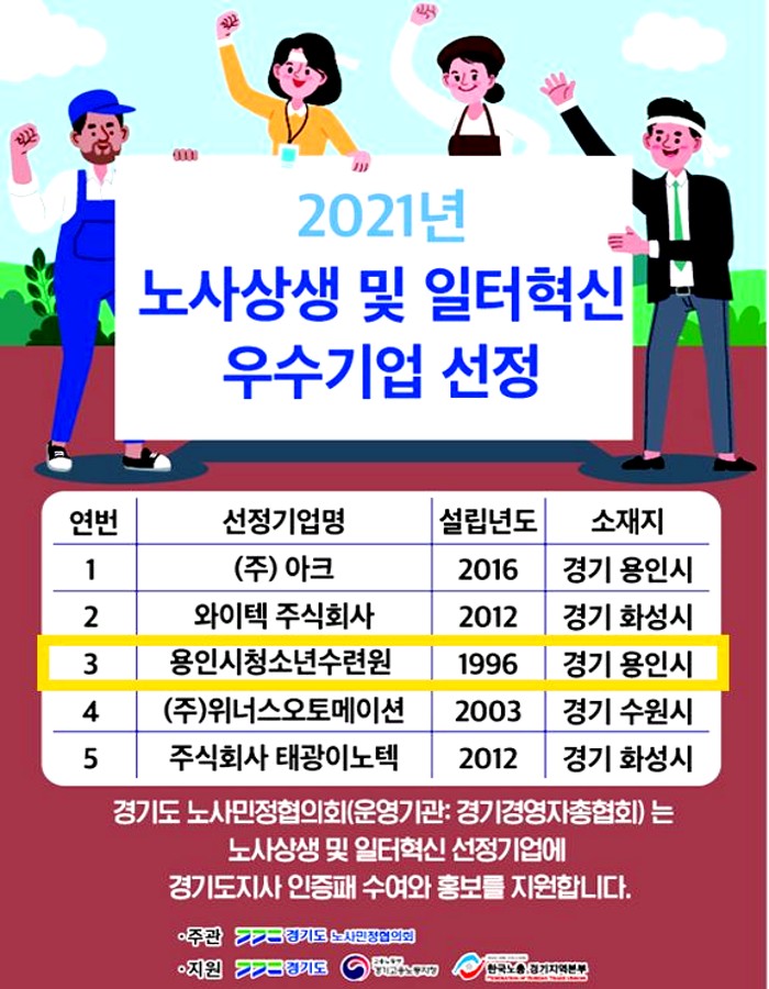 재단법인 용인시청소년미래재단(이사장 백군기) 용인시청소년수련원이 경기도노사민정협의회(운영:경기도경영자총협회)에서 주관한 “2021년도 노사상생 및 일터혁신 우수기업 선정 공모”에서 우수기업으로 선정되어 경기도지사의 인증패 수여와 홍보를 지원받게 되었다.
