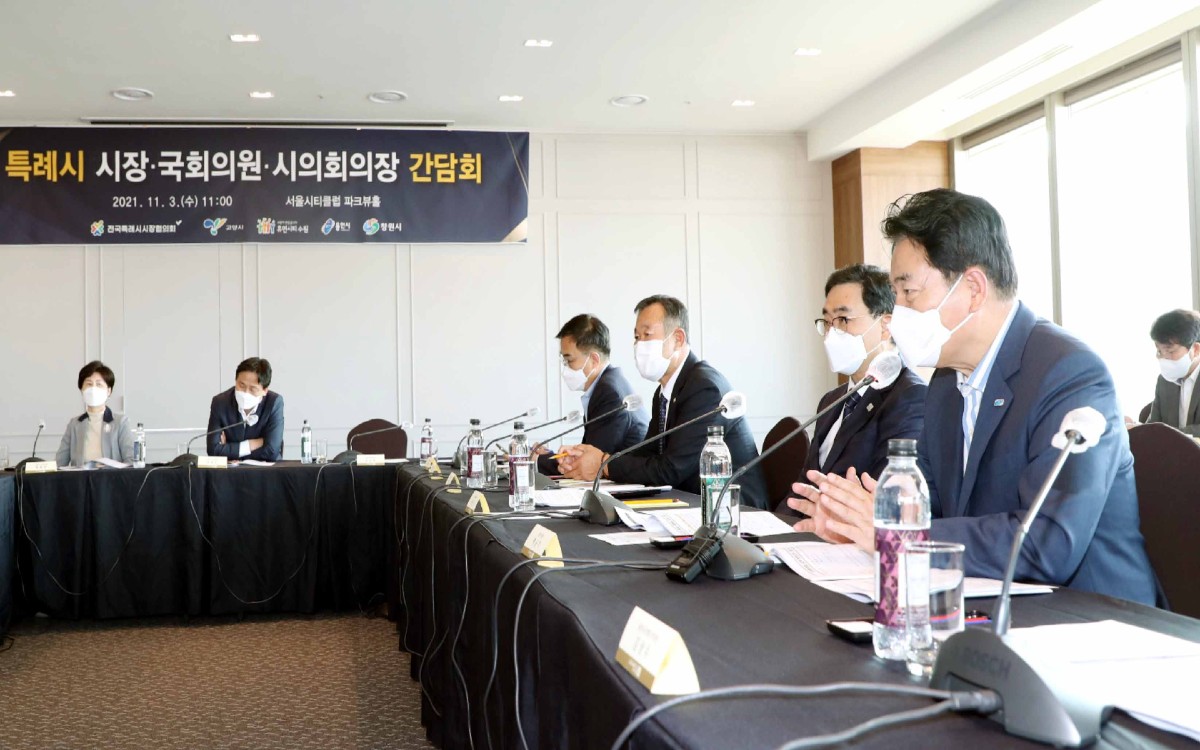 백 시장은 3일 서울 여의도 서울시티클럽 파크뷰에서 이재준 고양시장, 염태영 수원시장, 허성무 창원시장, 정춘숙·이탄희 국회의원, 김상수 용인시의회 부의장 등 4개 특례시 시장·국회의원·시의회 의장과 간담회를 갖고 대도시 특례사무를 담은 ‘지방분권법 개정 및 (가칭)제2차 지방일괄이양법 국회 정상 심의 촉구 성명서’를 발표했다.