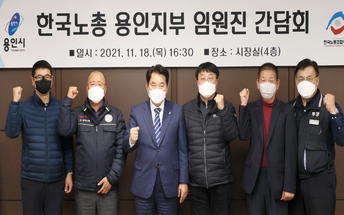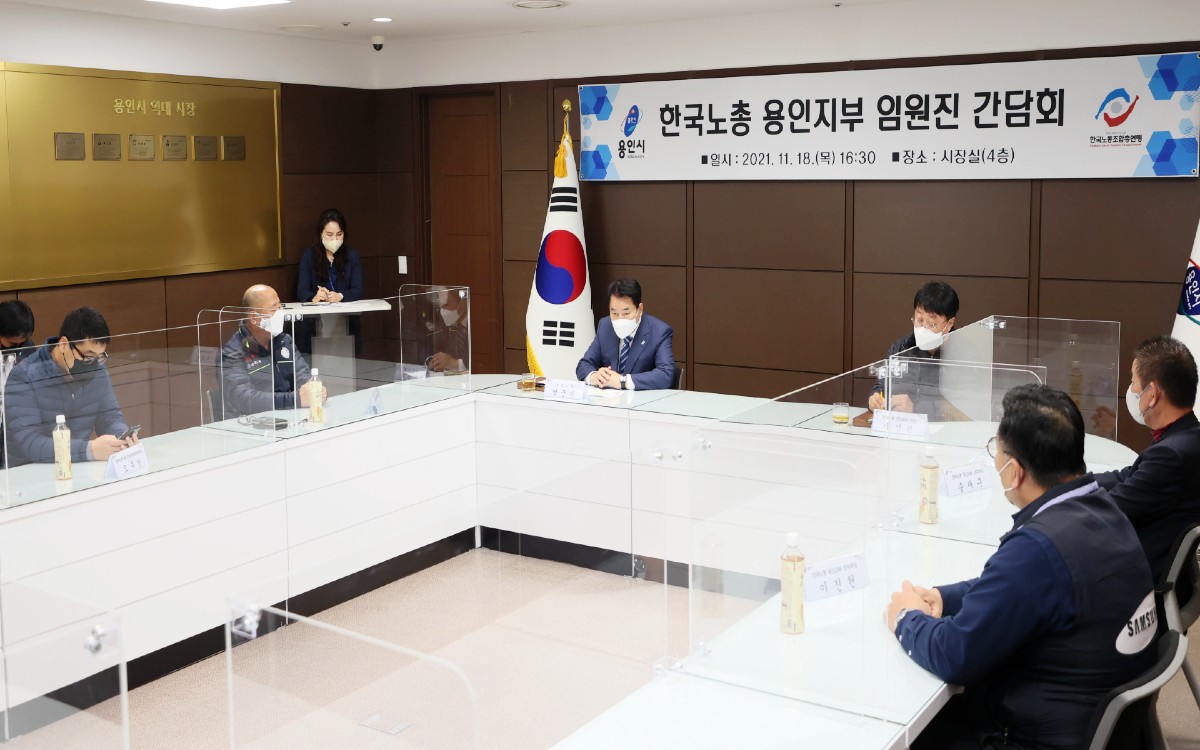 백군기 용인시장은 18일 시장 접견실에서 노동자 권익증진과, 상생하는 노사문화 조성을 위한 의견을 듣기 위해, 한국노총 용인지부 임원들과 간담회를 가졌다.