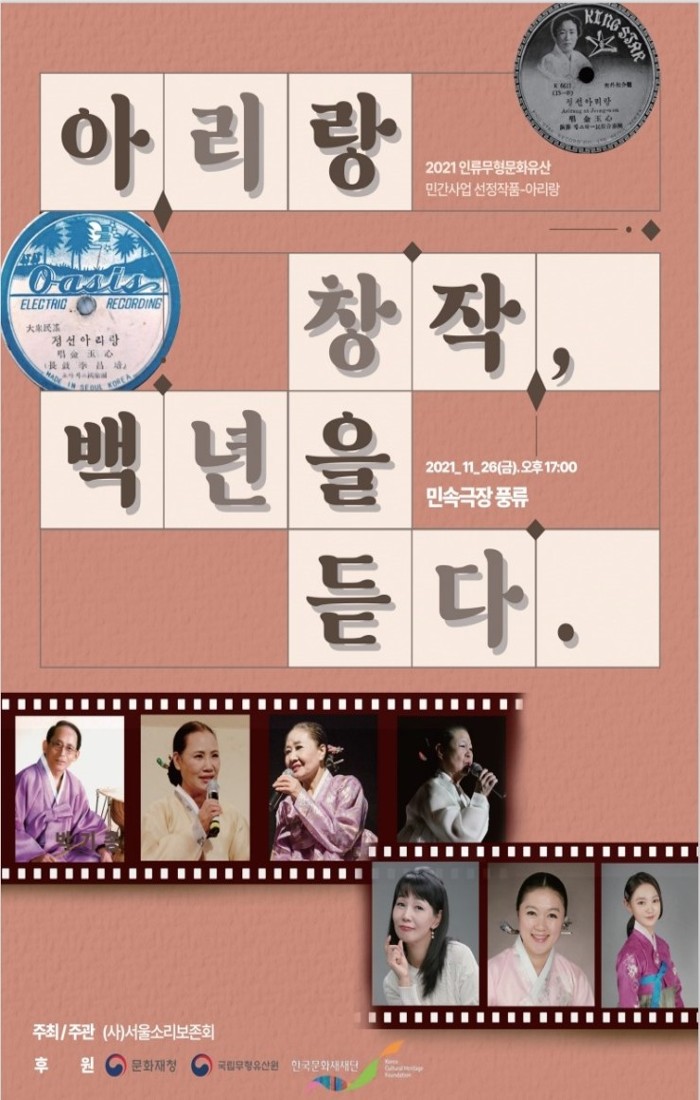 일제강점기 민족적 울분을 삼키며 저항의 선율로 태어난 창작 아리랑의 1백년 역사를 되짚어보는 뜻깊은 공연 ‘아리랑 창작, 백년을 듣다’가 11월 26일(금) 오후 5시 서울 강남구 민속극장 풍류에서 열린다.