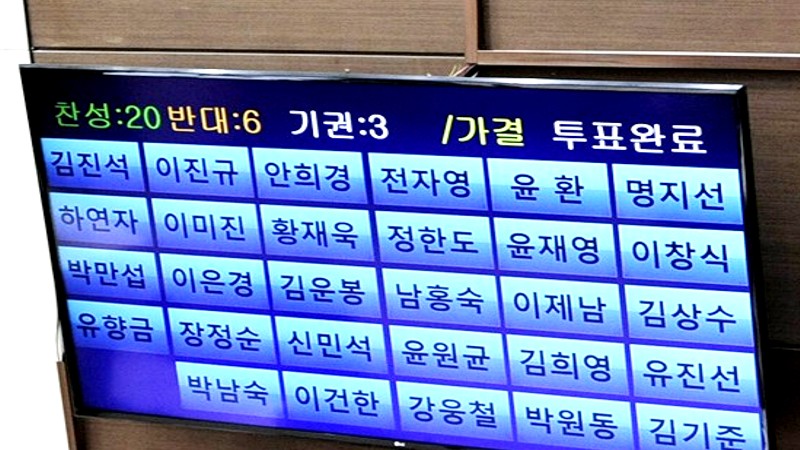 발언이 끝난 뒤 이어진 무기명 찬반 투표에서 재적의원 29명 가운데 찬성 20명, 반대 6명, 기권 3명으로 결의안은 통과됐다.