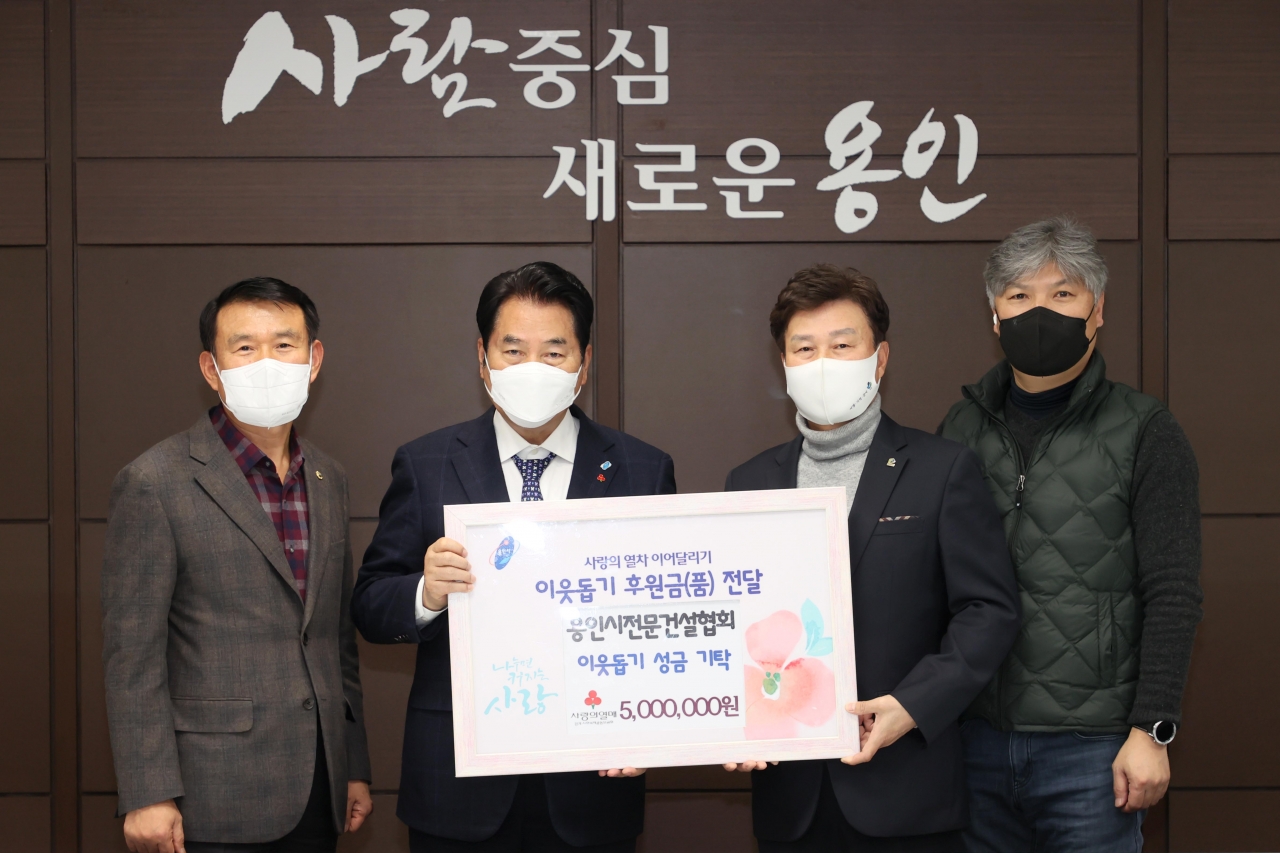 용인시는 7일 용인시전문건설협회 이정성 수석 부위원장 등 관계자 3명이, 백군기 시장실을 방문해 성금 500만원을 기탁했다고 밝혔다.