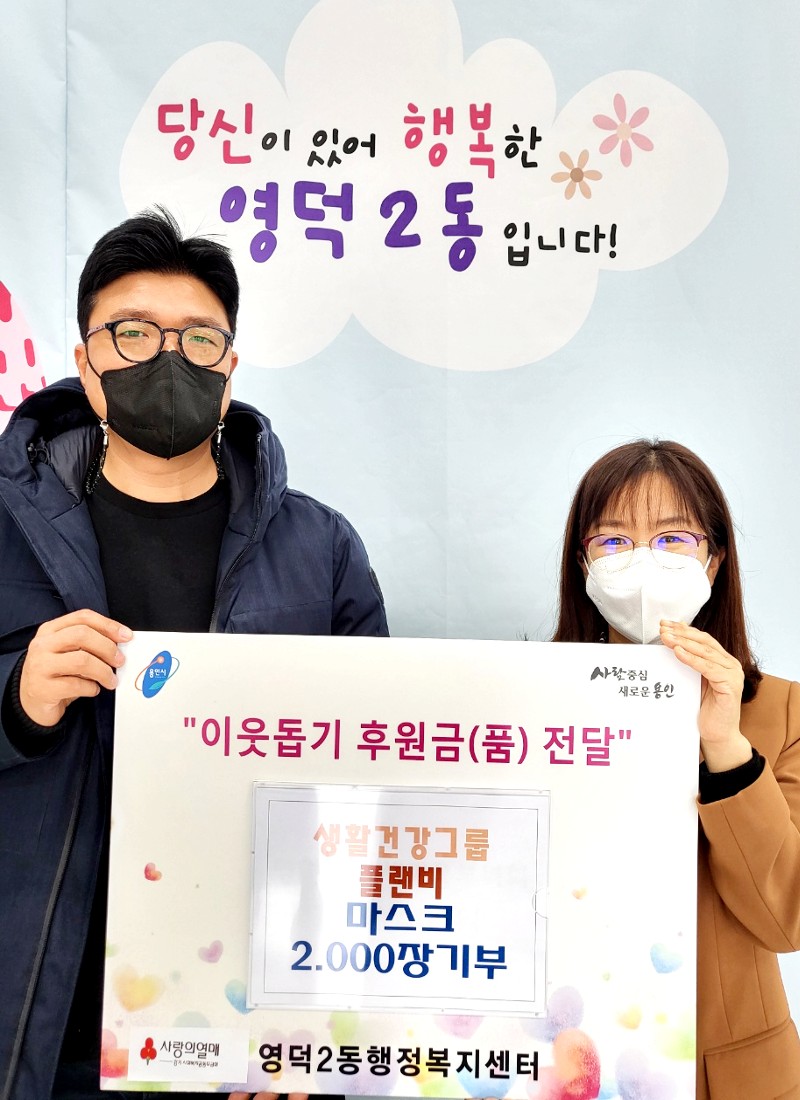 영덕2동에선 생활건강그룹 PLAN B 김나경 대표가, 어려움을 겪고 있는 저소득층을 위해 써 달라며 KF94 마스크 2000장을 전달했다.