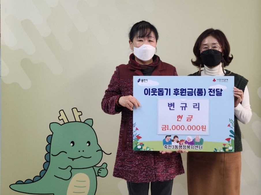 죽전3동에선 31통 통장 변규리 씨가 어려운 이웃을 위해 써 달라며, 성금 100만원을 기탁했다.