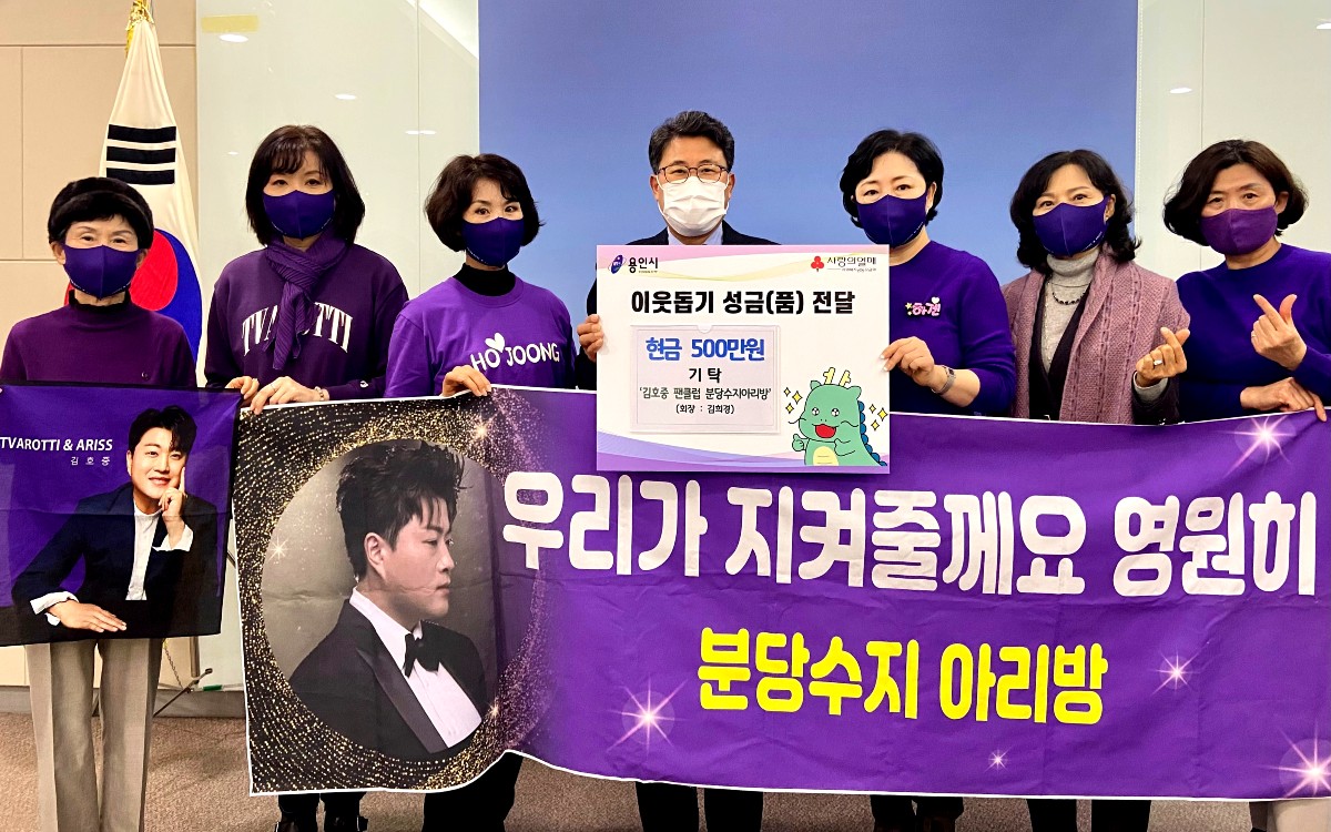 용인시 수지구는 10일 가수 김호중 팬카페 ‘분당·수지 아리방’ 회원들이 어려운 이웃돕기에 써달라며 성금 500만원을 기탁했다고 밝혔다.