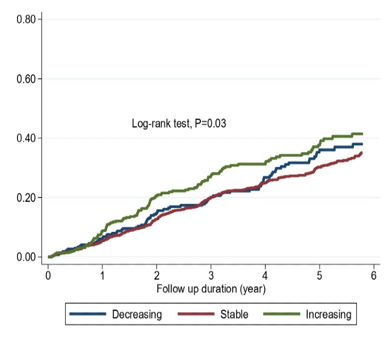 교수팀은 1년 사이의 혈압 변화를 궤적 모델링(Trajectory modeling) 하여 참가자들을 증가, 감소, 안정의 세 군으로 나누고, 신장 기능 저하 및 말기신부전 진행 결과를 생존분석을 통해 살폈다.