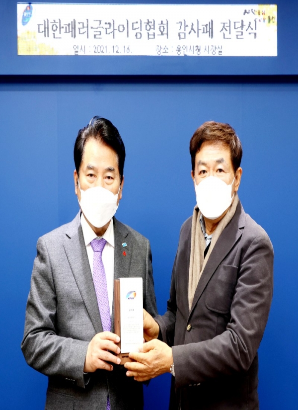 대한패러글라이딩협회는 16일 시청 시장실에서, 용인시가 처인구 모현읍 초부리 용인자연휴양림 내 패러글라이딩 이착륙장을 조성한 데 대한 고마움을 담은 감사패를 전달했다.