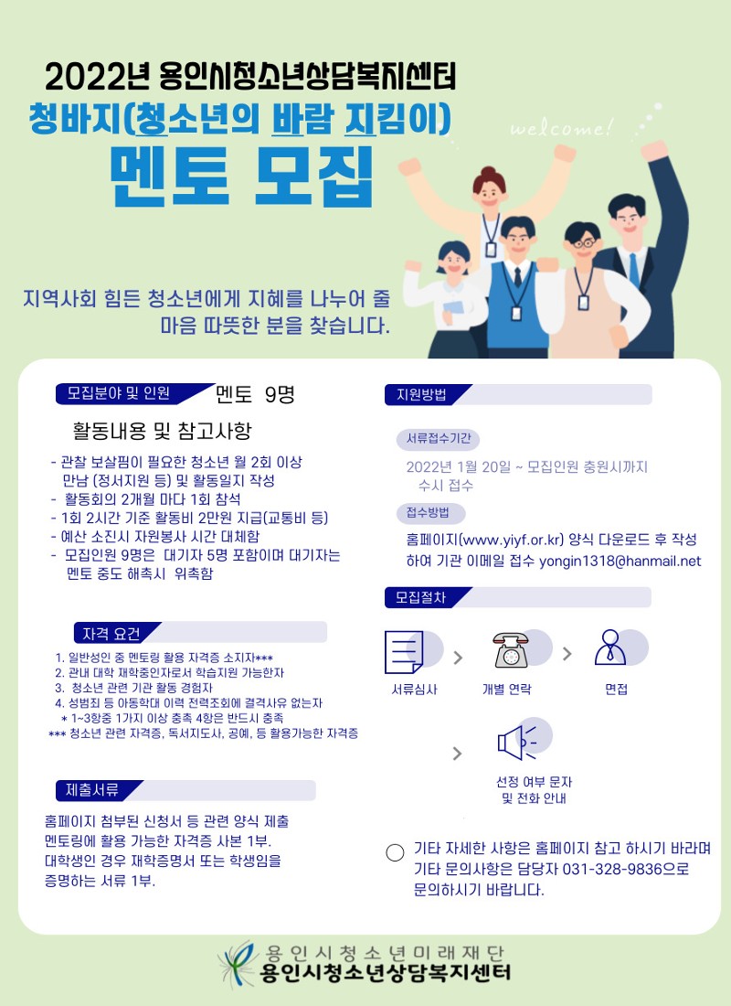 재단법인 용인시청소년미래재단(이사장 백군기) 용인시청소년상담복지센터에서는 2022년도 청·바·지(청소년의 바람 지킴이) 사업으로, 지역사회 심리 정서적으로 어려움을 느끼는 청소년에게 도움을 줄 수 있는 멘토를 현재 모집 중에 있다.