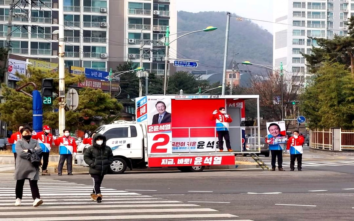 국민의힘 윤석열 대통령 후보를 홍보하기 위한 용인 지역 유세차량엔 'AI윤석열'의 정책영상이 탑재되어 있다.