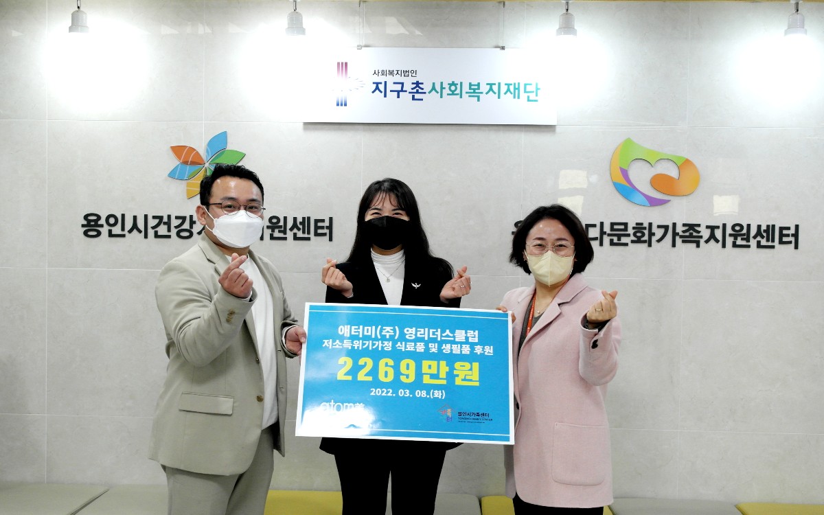 지난 3월 8일(화) 애터미㈜(회장 박한길)와 애터미 회원들로 구성된 자원봉사단 애터미 영리더스클럽에서 용인시 내 어려운 이웃에 전달해달라며, 식료품 및 생필품(라면, 물티슈 등)을 용인시가족센터(센터장 이수희)에 후원품을 전달하였다.