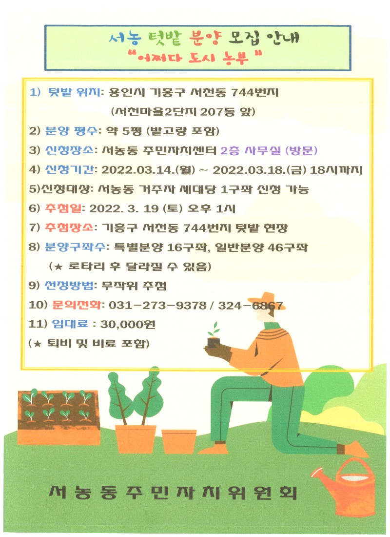 서농동 주민자치위원회(위원장 금길순)가 오는 14일부터 18일까지, ‘어쩌다 도시농부’ 텃밭 62구좌를 분양한다.