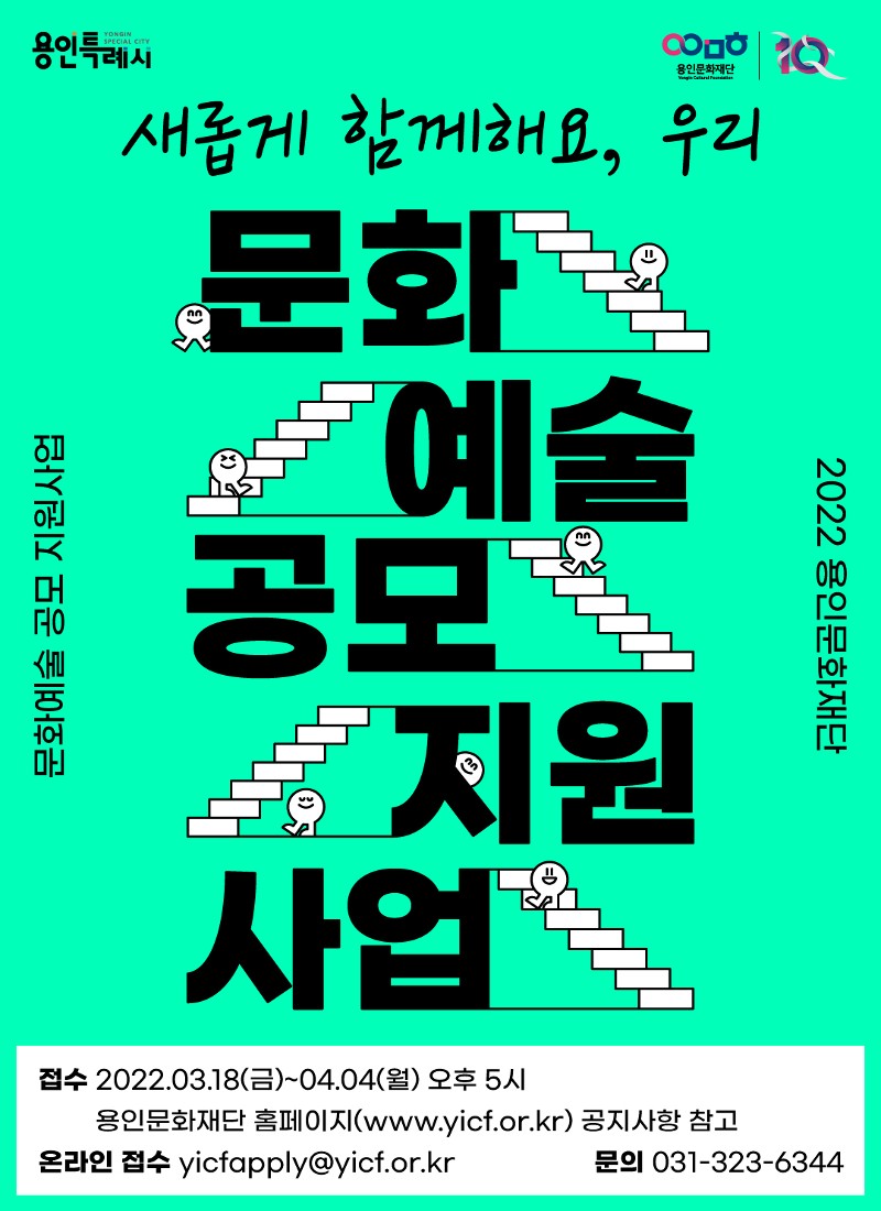 (재)용인문화재단(이사장 백군기)은 코로나19가 장기화되면서, 예술 활동이 위축된 지역 예술인에게, 지속 가능한 맞춤형 문화예술 향유 기회를 제공하기 위해, 새롭게 개편한 ‘2022 문화예술 공모 지원사업’를 4월 4일까지 온라인으로 접수받는다.