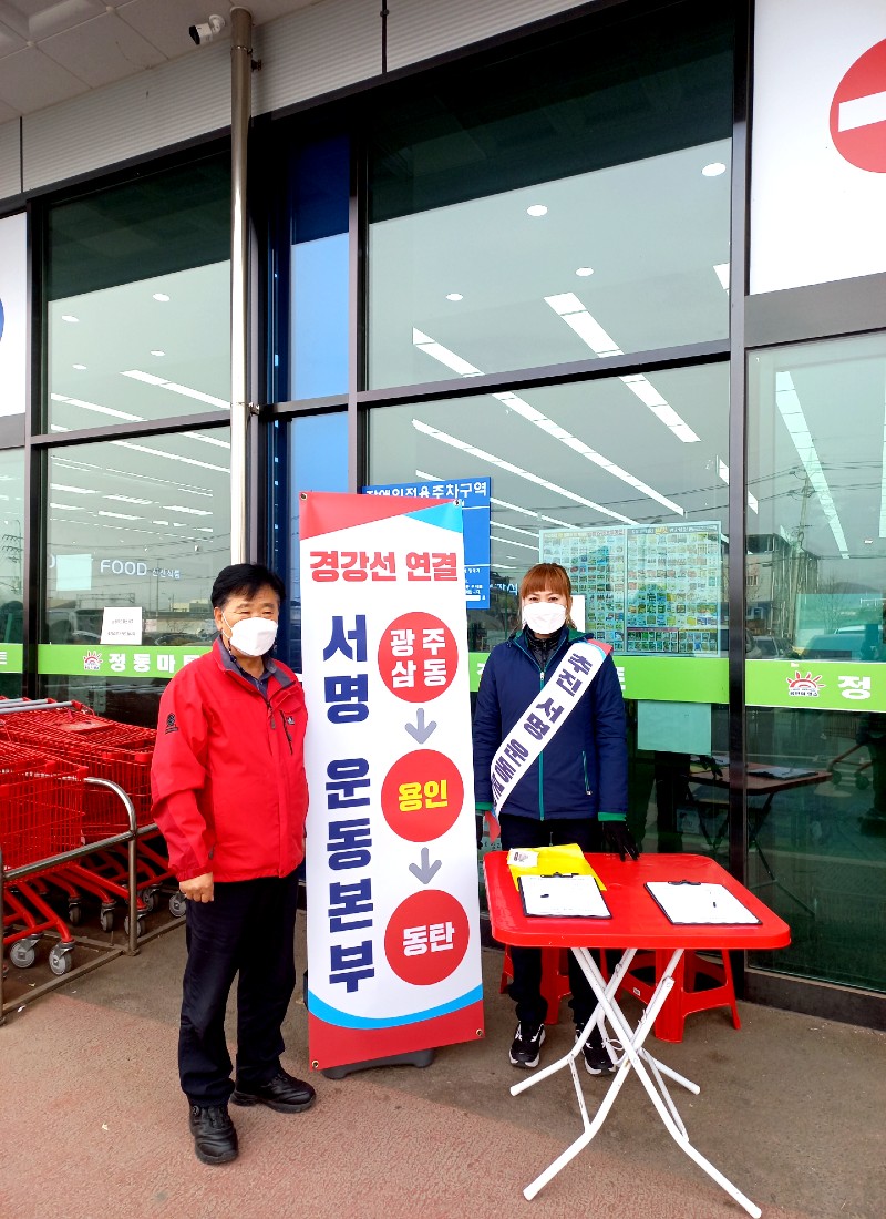 서명운동에 앞장서고 있는 이건영 전의원은"많은분들이 함께 서명운동에 동참해 주시고 계십니다. 처인구민들이 대동단결하여 경강선 연장을 이루어야 합니다.시민의 힘이 얼마나 강한지 저력을 보여야합니다. 처인구민들의 많은 서명이 필요합니다. 많은서명을부탁드립니다"라며 서명운동을 전개해 나가고있다.
