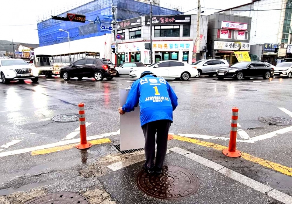 이 봄비가 일년 농사의 큰 힘이 되듯 저또한 지역의 초석이되겠습니다. 많은 조언 부탁드립니다."라며 촉촉히 내리는 봄비를 맟으면서 시민들에게 인사를 하고있다.