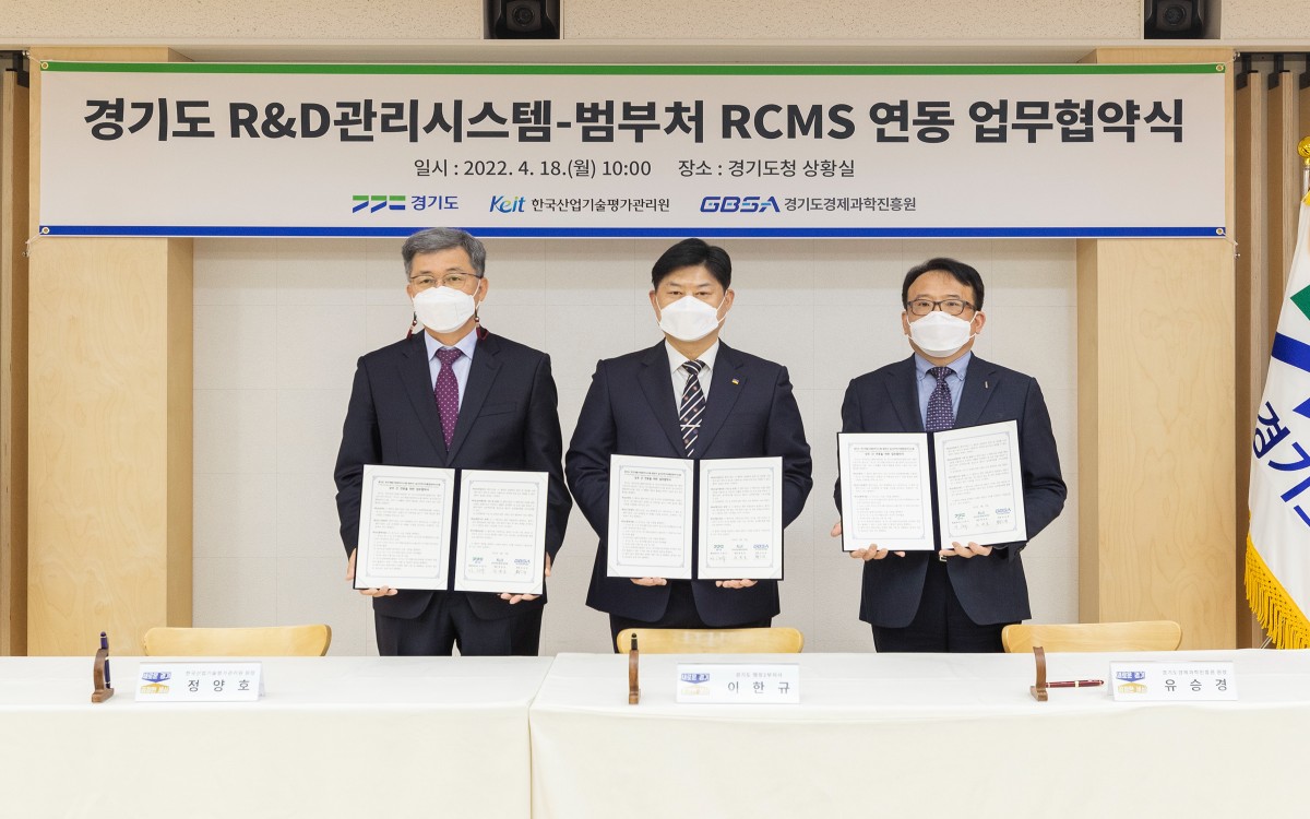이한규 경기도 행정2부지사와 정양호 한국산업기술평가관리원장, 유승경 경기도경제과학진흥원장은 18일 경기도청 상황실에서 이런 내용을 담은 ‘경기도 연구개발사업관리시스템(G-PMS)-중앙부처 연구비통합관리시스템(RCMS) 상호 간 연동을 위한 업무협약’을 체결했다.