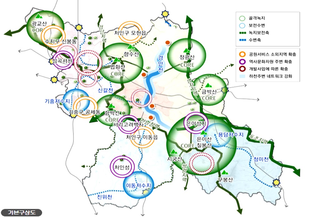 ▲이동저수지 ▲기흥저수지 등 수변공간과 경안천, 진위천 등 수변축을 활용한 선형 녹지 네트워크도 강화해 나간다.