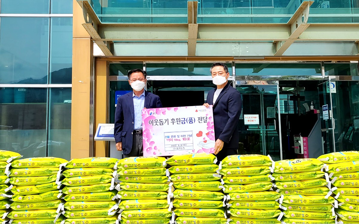 이날 기탁한 쌀은 지난달 ㈜오디스가 새로운 사옥을 준공해, 이전하면서 축하 화환 대신 받은 것이다.